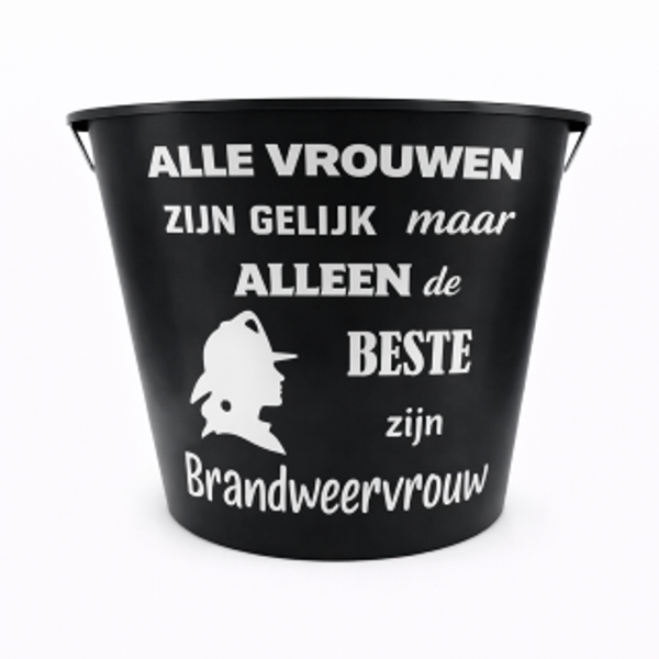 Zwarte bedrukte emmer van 12 liter met “Alle mannen zijn gelijk maar alleen de beste zijn brandweerman” opdruk.