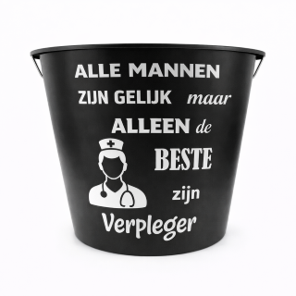 Zwarte bedrukte emmer van 12 liter met “Alle vrouwen zijn gelijk maar alleen de beste zijn verpleegkundige” opdruk.