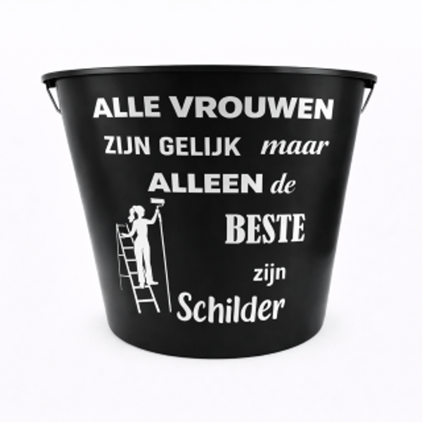 Zwarte bedrukte emmer van 12 liter met “Alle mannen zijn gelijk maar alleen de beste zijn schilder” opdruk.
