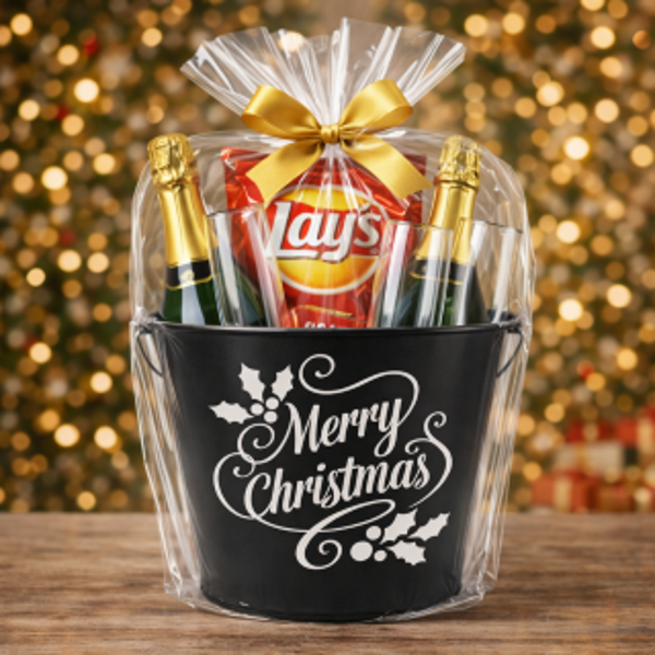 Zwarte bedrukte emmer van 12 liter met “Merry Christmas” opdruk.