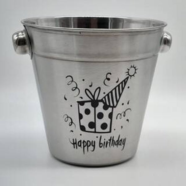 Deze ijsemmer is speciaal ontworpen om één fles gekoelde drank vast te houden. Gemaakt van hoogwaardig roestvrij staal (RVS), garandeert deze ijsemmer duurzaamheid en langdurige prestaties. De bedrukking van de woorden "Verjaardag" of "Happy Birthday" maakt dit cadeau extra persoonlijk en feestelijk.