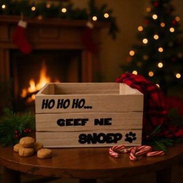 Dit leeg houten honden kerst-kratje met vaste tekst is een originele en speelse basis om zelf een persoonlijk kerstcadeau samen te stellen voor je trouwe viervoeter.