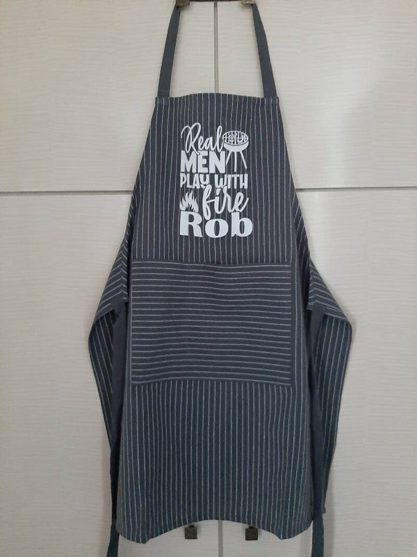 Dit katoenen gepersonaliseerd gestreept keukenschort is voorzien van 2 zakken. Een uniek kado voor een echte keukenprins of prinses. 🔪 In 2 kleuren verkrijgbaar in het groen en het donkergrijs.